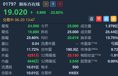新东方在线(01797.HK)今日(20日)股价急回逾两成,截至发稿最新报19.32元,跌23.92%,市值190.3亿港元,公司旗下「东方甄选」抖音直播间截至今日上午录粉丝逾1,688万名。