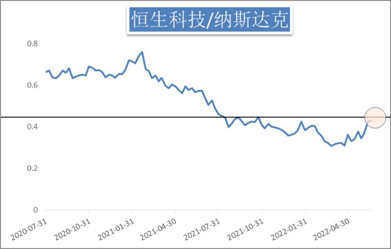 恒生科技指数普遍被认为是中国的纳斯达克100,和纳斯达克走势一直非常趋同,但是去年两者走势极端分化,今年开始二者又开始趋同,目前恒升科技/纳斯达克比值已经上升到去年10月份的水平。