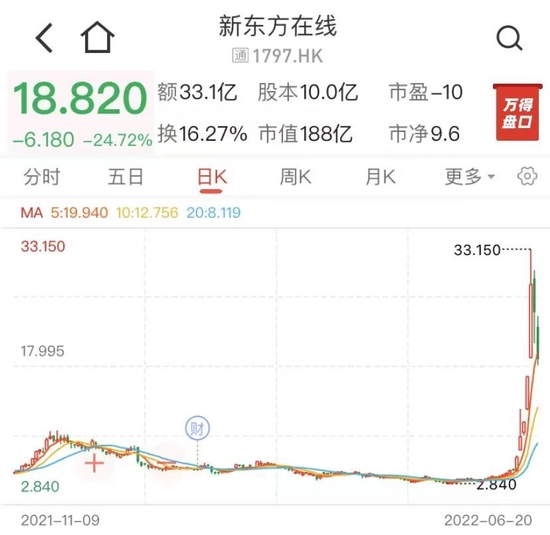 6月20日早盘,新东方在线跌幅超过20%,跌破20港元,此后股价跌幅进一步扩大。截至发稿,新东方在线股价大跌超32%,跌破17元/股,较上周四高点回落近50%。