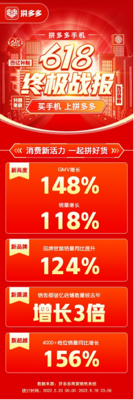另外,在拼多多发布的618手机“真香”战报中显示,截至18日23:59的数据显示,在全网最高性价比的优势下,平台手机类目在618期间继续保持了强劲势头,全类目销售额同比增长148%,订单量同比增长118%。