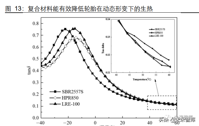 胎面配方:根据《应对新能源汽车发展规划轮胎胎面配方应用新材料》,新能源汽 车轮胎在橡胶组分、橡胶填料、偶联剂和助剂方面可以进行配方的改变,便有望达 到滚动阻力和抓地性能的平衡。(1)橡胶组分:分子主链改性的溶聚丁苯橡胶 (HPR850 和 LRE-100)可以明显减弱复合材料中填料的 Payne 效应,改善填料在 橡胶基体中的分散,从而可以有效降低复合材料在动态形变下的生热。因此,优先 选择改性溶聚丁苯橡胶,可以达到滚动阻力和抓地性能的平衡;(2)填料:以白炭 黑为主,同时选用合适的无机填料进行并用;(3)偶联剂:可选用 NXT 来达到较 低的滚动阻力,同时平衡了加工性能;(4)助剂:一些提高抗撕裂、降低门尼黏度 的助剂可以参与橡胶交联反应,能够防止助剂逸出,提高白炭黑分散性。