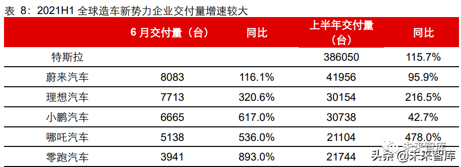 2021H1,头部造车新势力基本延续了 2020 年的趋势,在销量、品牌认知度等方面继续 快速提升。2021H1,特斯拉以 38.6 万辆的销量占据全球首位,蔚来销量达 4.3 万辆, 小鹏和理想销量均超过 3 万辆,哪吒与零跑销量也均超过 2 万辆。由此可见,尽管当前 造车新势力车企产销量不及传统车企,但在可预见的将来,造车新势力将成为引领新能 源汽车浪潮的一股中坚力量。