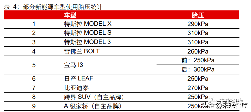 轮胎胎压:新能源车型相比传统车型胎压较高(平均在 270kPa 左右,而传统车型 大多在 220kPa 左右),主要原因有两点:(1)车辆重量:由于新能源车型相比传 统车重量较重。以帝豪 GSE(新能源)和帝豪 GS(燃油)为例:帝豪 GSE 重为 1635kg;帝豪 GS 最高配车重为 1398kg,二者相差 250kg,因此如果仍然维持和 传统车相同的胎压会造成轮胎负载率过高,有一定的安全隐患。(2)提升续航里程:较高的胎压,可以减少轮胎滚动过程中的能量损失,从而提升续航里程。“高胎压” 对于未来新能源车型设计是必然的趋势。在新能源车型开发时轮胎在满足载荷率 的基础上适当提升胎压,从而帮助提升续航里程。