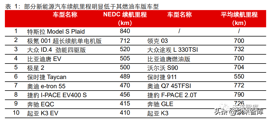(1)新能源汽车较传统燃油车对续航能力更为敏感。在现有电池材料技术尚未突破的 前提下,如何提高新能源汽车的续航能力始终是行业亟待解决的核心问题。根据 NEDC 及小熊油耗的数据,大部分新能源汽车的 NEDC 续航里程均在 500 公里以下,而与之 同品牌相对应的传统车型的续航里程却普遍在 700 公里以上。此外,电动车一般随着使 用年限的增加,电池的储能能力也会逐渐衰减,这就意味着电动车的续航能力会是消费 者重点关注的主要指标。