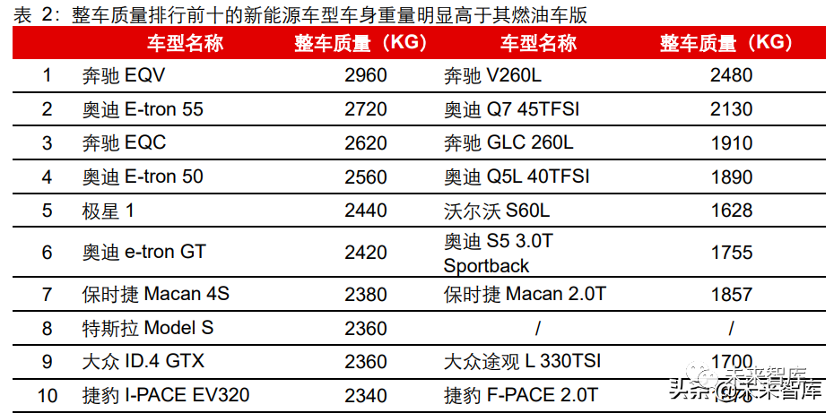 同级别新能源汽车较传统燃油车更重。挪威电动汽车专家比约恩.尼兰公布了对全球部 分电动汽车进行称重的结果,榜单中最重的非 MPV 电动车为奥迪 e-tron 55,其重量超 过 2.7 吨,而与之同级别的奥迪 Q7 45TFSI 重量仅为 2.1 吨。随着未来中大型电动汽车 的出现,预计整体平均重量进一步上升的可能性很大。