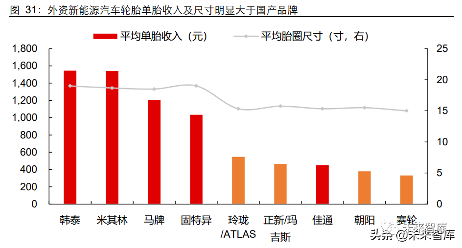 现状 1:海外轮胎配套轮胎尺寸大于国产品牌。韩泰、米其林、马牌、固特异所配 套的新能源汽车轮胎单胎尺寸明显大于国产品牌,上述四家企业所配套车型的平 均轮胎尺寸为 18.8 寸,而国产品牌为 15.4 寸。