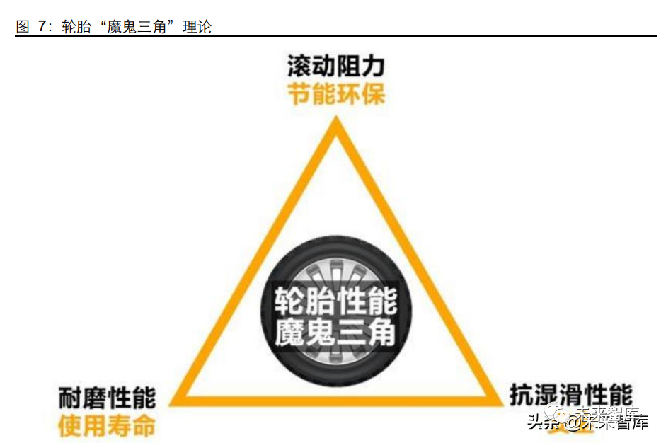 轮胎存在“魔鬼三角”,很难同时满足高滚阻、高耐磨性及抗湿滑性三项指标。轮胎行业 曾经存在“魔鬼三角”理论,指的是轮胎的三项指标,即滚动阻力、耐磨性和抗湿滑性。这三项指标相对平衡,如果有一项指标发生了改变,其他两项也会随之改变。比如,如 果一款轮胎的滚动阻力小,那么,它的耐磨性就会提升,但它的抗湿滑性便会随之降低。这样带来的结果就是车辆在行驶中燃油经济性会出色一些,但是在操控性和安全性上就 会有所降低。