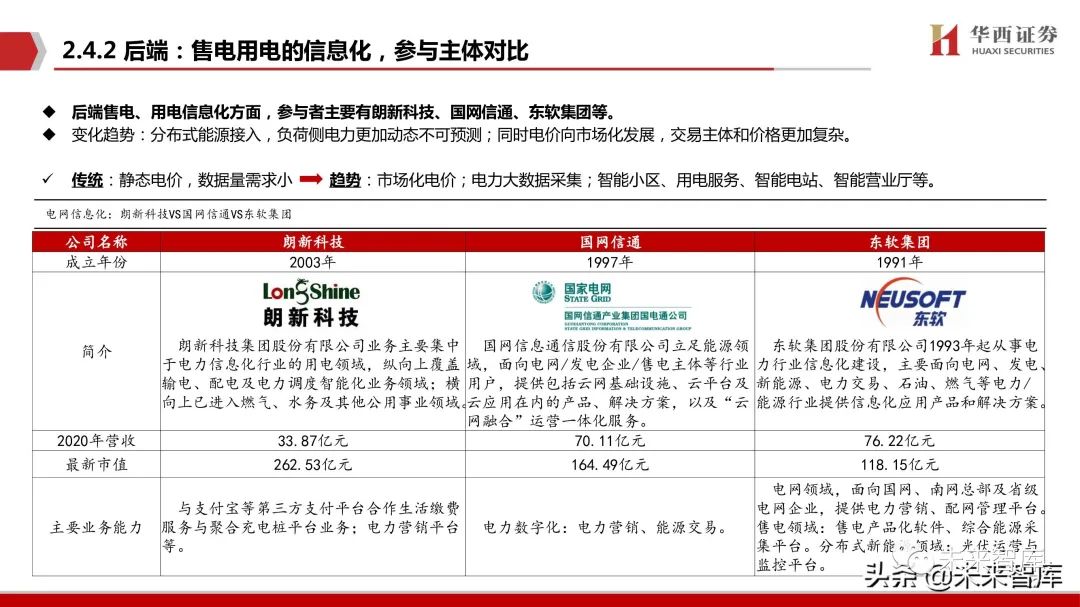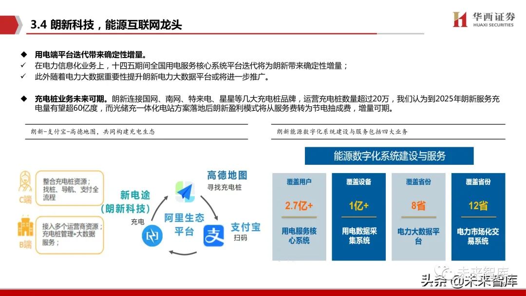 用电端平台迭代带来确定性增量。 在电力信息化业务上,十四五期间全国用电服务核心系统平台迭代将为朗新带来确定性增量;此外随着电力大数据重要性提升朗新电力大数据平台或将进一步推广。(报告来源:未来智库)