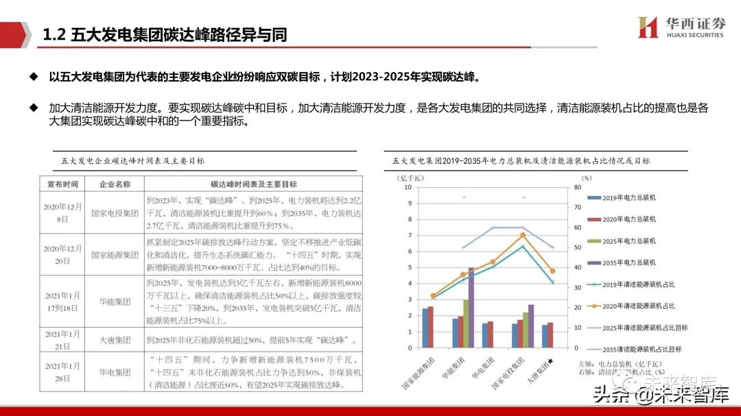五大发电集团碳达峰路径异与同:以五大发电集团为代表的主要发电企业纷纷响应双碳目标,计划2023-2025年实现碳达峰。 加大清洁能源开发力度。要实现碳达峰碳中和目标,加大清洁能源开发力度,是各大发电集团的共同选择,清洁能源装机占比的提高也是各 大集团实现碳达峰碳中和的一个重要指标。