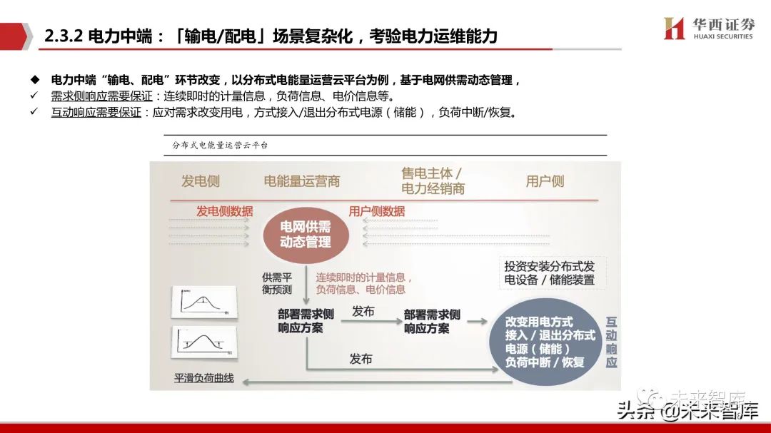 电力中端“输电、配电”环节改变,以分布式电能量运营云平台为例,基于电网供需动态管理, 需求侧响应需要保证:连续即时的计量信息,负荷信息、电价信息等。互动响应需要保证:应对需求改变用电,方式接入/退出分布式电源(储能),负荷中断/恢复。