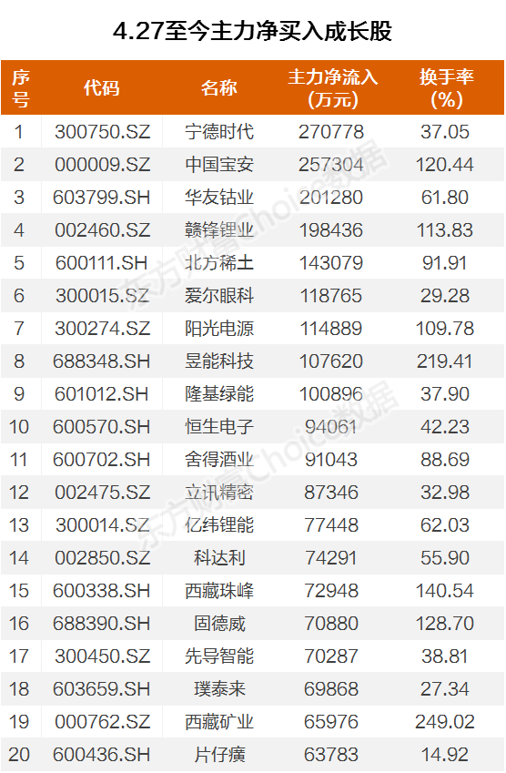 从行业分布看,主力资金偏好赛道股,宁德时代、中国宝安、华友钴业、赣锋锂业、阳光电源等净买额靠前的个股均为锂电、光伏、储能等各赛道中的龙头股。