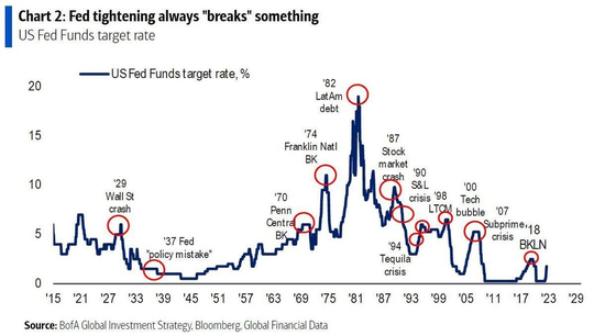 下面的图表显示了来自该行的提醒,美联储倾向于在其紧缩周期中打破某些东西。