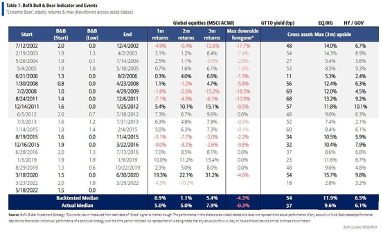 Hartnett观察到,该指标曾在2002年8月、2008年7月、2011年9月、2015年9月、2016年1月和2020年3月跌至0。下表显示,过去当该指标归零时,美股之后3个月的回报一直很强劲,除了2002年的“双底衰退”或2008年和2011年的系统性事件。