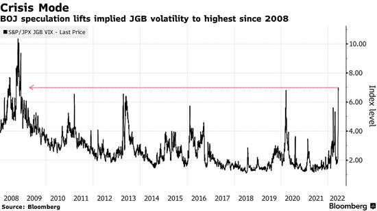 上周五(6月17日),10年期日债的隐含波动率已升至2008年全球金融危机以来的最高水平,随后有所缓解。当日,日本央行表示,其债券购买行为将持续很长一段时间。