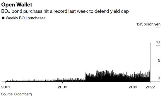 外媒汇编的数据显示,上周日本央行购买了10.9万亿日元(合808亿美元)的国债,创下历史最高纪录。