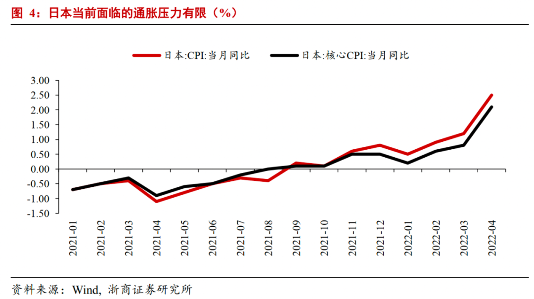 这也是我们认为本轮全球货币紧缩周期中,欧洲风险大于日本的根本原因。日本国内通胀压力小,使得日本央行可以无视国际投资者的质疑,进一步践行宽松政策,不会导致国内经济尤其是物价环境的恶化。