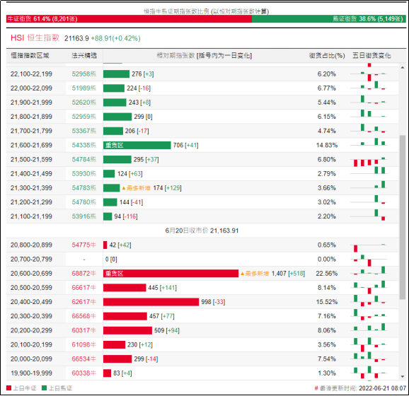 街货分布方面,至周一,恒指牛证街货重货区间主要在收回价20400点至20900点之间,累计相当约2892张期指合约;恒指熊证街货重货区主要在收回价21100点至21700点,累计相当约1537张期指合约。