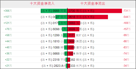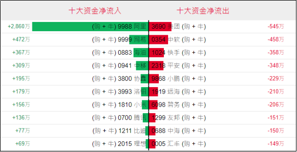 淡仓(认沽证及熊证)方面,周一阿里、银河相关淡仓单日分别录得约356万、157万港元资金净流入;相反,腾讯、京东、海油相关淡仓单日分别录得约731万港元、544万港元、169万港元资金净流出。
