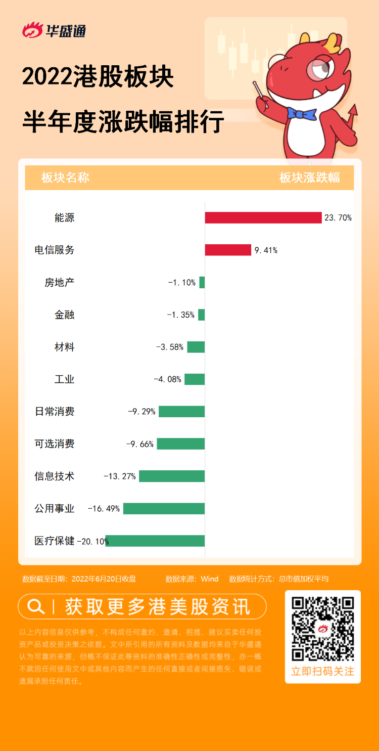 据Wind数据显示,截至6月20日,能源板块与电信服务板块表现最优,分别上涨23.7%与9.41%,其他行业板块均呈不同幅度的下跌,而医疗保健则是上半年最大的输家,累计跌幅达20.1%。