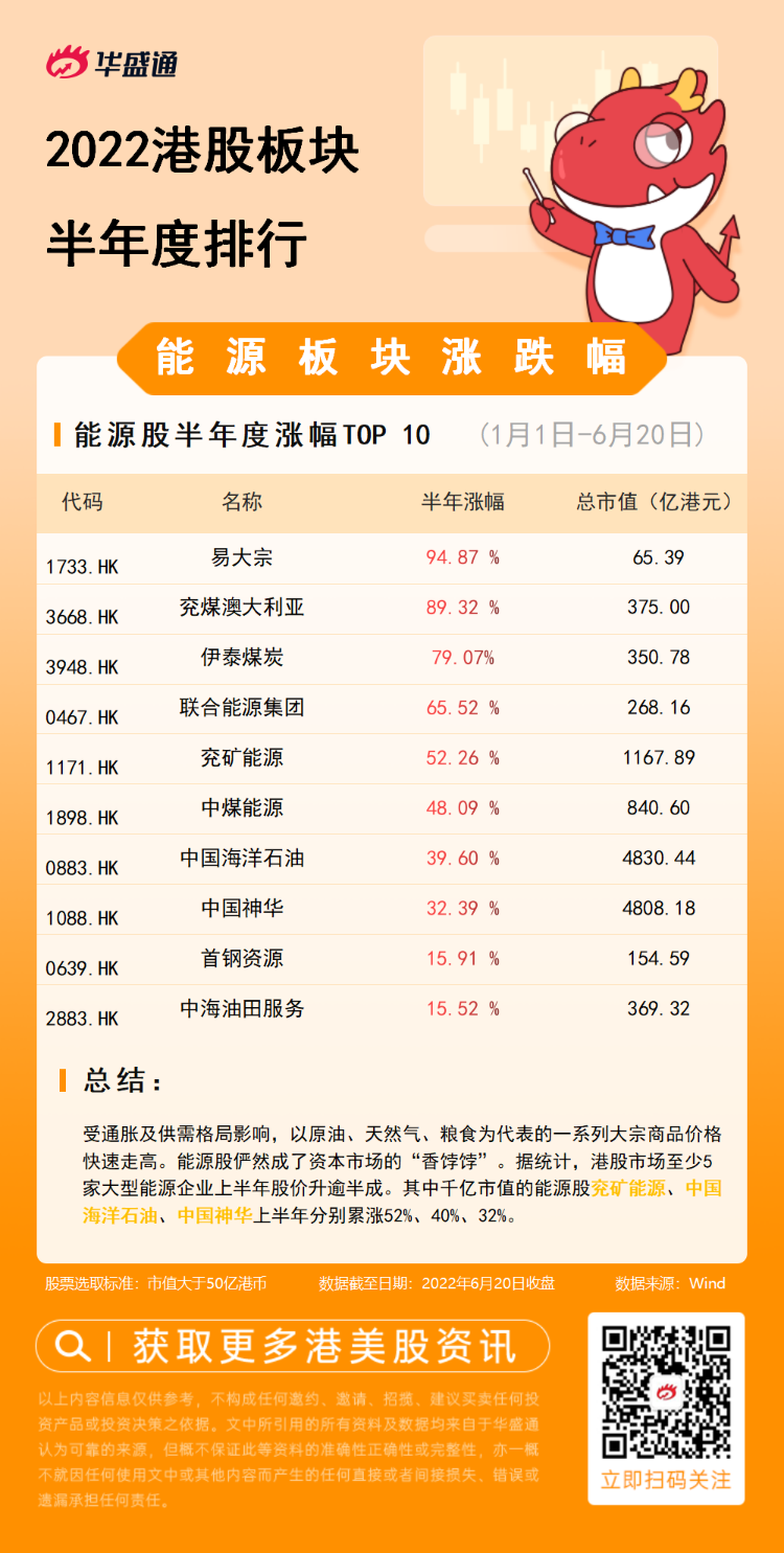 全球大宗商品价格上涨推动能源板块大幅上涨。据统计,今年以来港股市场至少5家大型能源企业股价升超半成,其中易大宗半年股价大涨95%,中国海洋石油、中国神华等千亿市值的能源企业上半年皆涨逾30%。(截至6月20日收盘,仅计算值大于50亿港元公司)