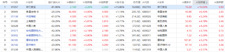 以A股收盘时间,AH股涨幅前10如下: