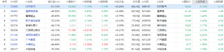 时代电气A股跌5.16%,H股跌1.14%;福莱特A股跌3.49%,H股涨0.85%;赣锋锂业A股跌3.42%,H股跌1.35%。