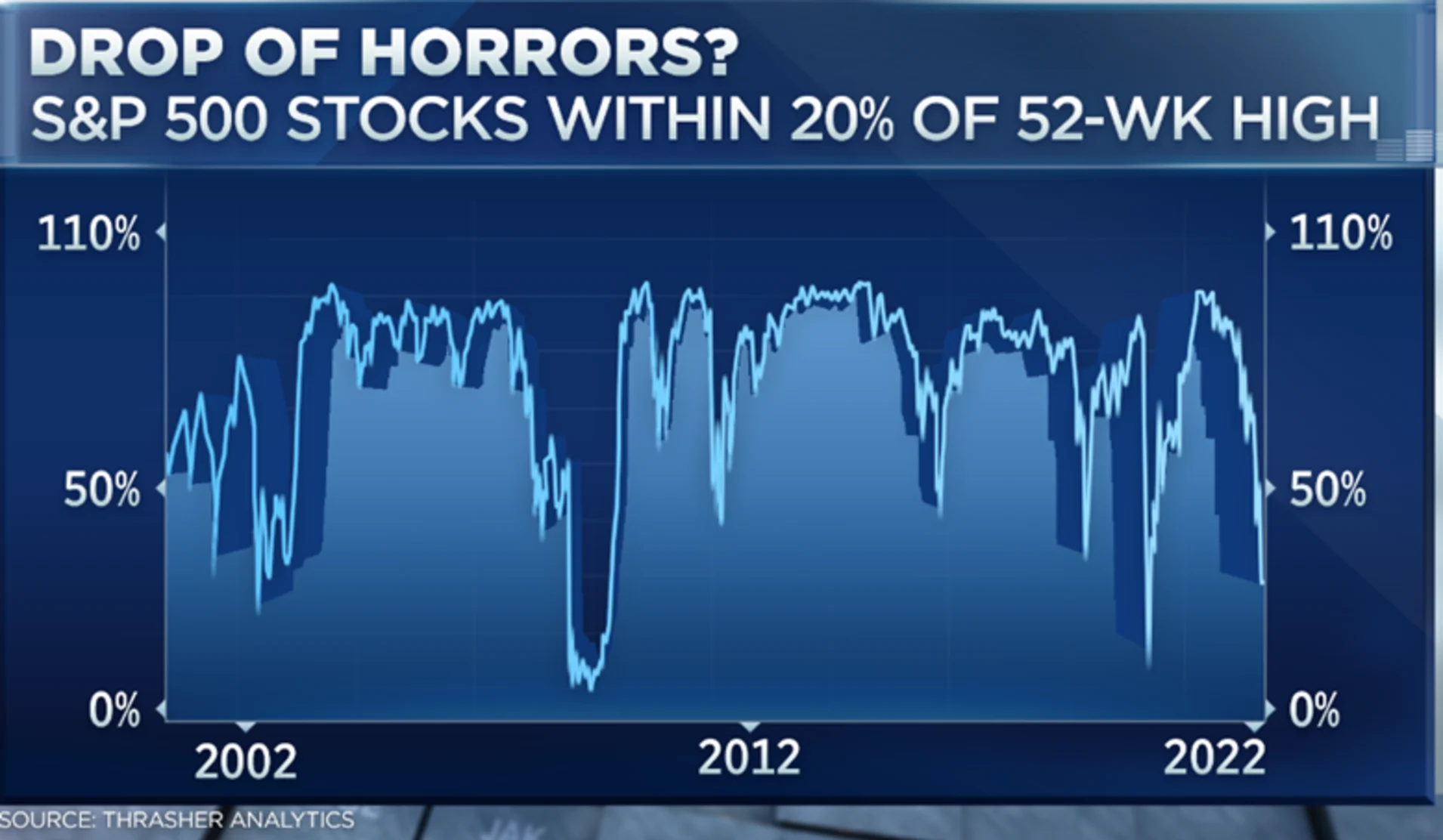 另一项指标表明股市这波下跌的影响很广泛,现在只有不到四分之一的成分股仍在52周高点的20%以内交投(即它们还没有较高点回落20%),如下方Thrasher Analytics的图所示。最近两次比这个读数更低的情况分别发生在:新冠疫情导致的股市暴跌那会,以及2007年-2009年金融危机导致的熊市期间。