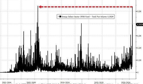 美股能源股ETF能源精选行业SPDR基金(XLE.US)上周狂挫超17%,跌幅仅次于2020年疫情突发、油价跌至“负值”时期。数据显示,当前做空XLE的看跌期权成交量已经升至2008年以来最高,暗示投资者押注能源行业将迎来下跌行情。