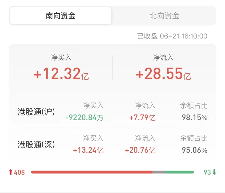 南下资金今日净买入港股12.32亿港元,其中港股通(沪)净卖出9220万港元,港股通(深)净买入13.24亿港元。上一交易日净买入港股3.13亿港元。