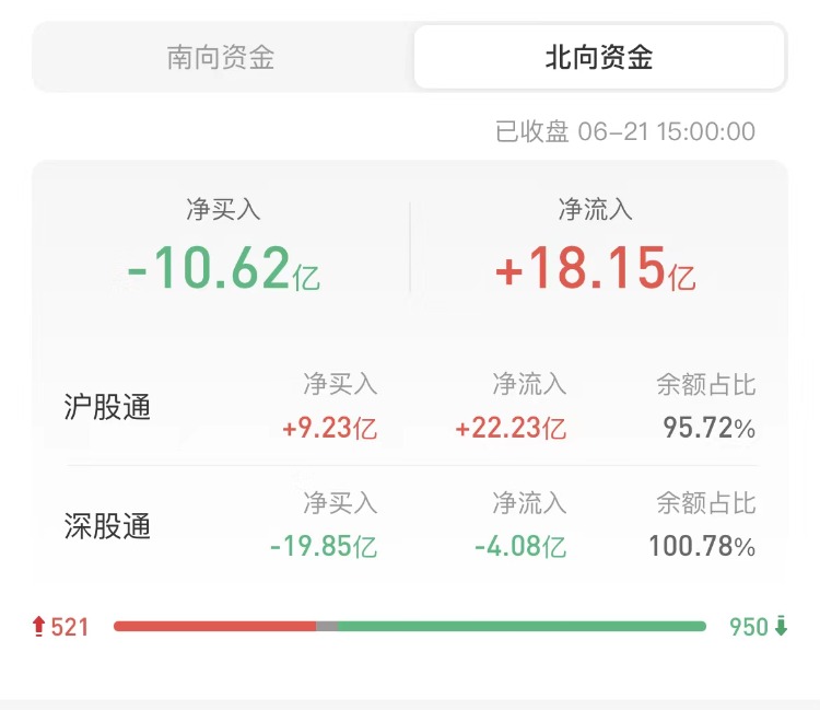 北上资金今日净卖出10.62亿元,沪股通净买入9.23亿元,深股通净卖出19.85亿元。上一交易日净卖出97.03亿元。