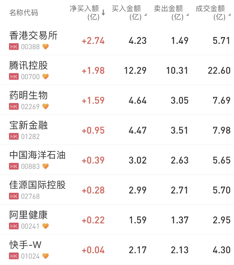 南下资金净买入香港交易所2.74亿港元,为今日买入之最。此外,南下资金净买入腾讯控股1.98亿港元,净买入药明生物1.59亿港元。