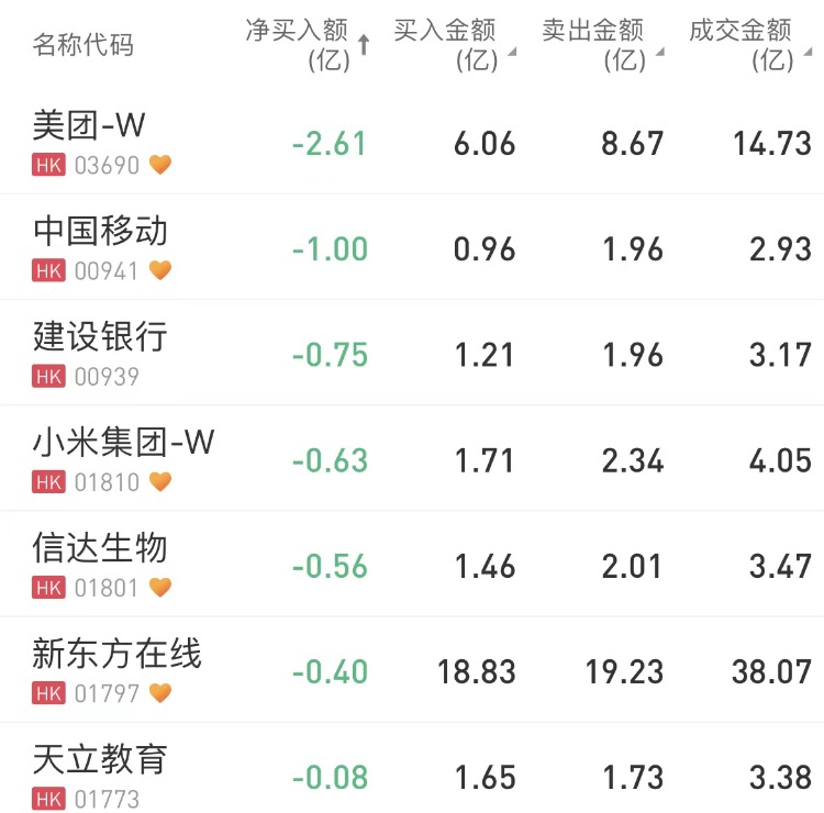 南下资金净卖出美团-W2.61亿港元,为今日卖出之最,净卖出中国移动1亿港元。
