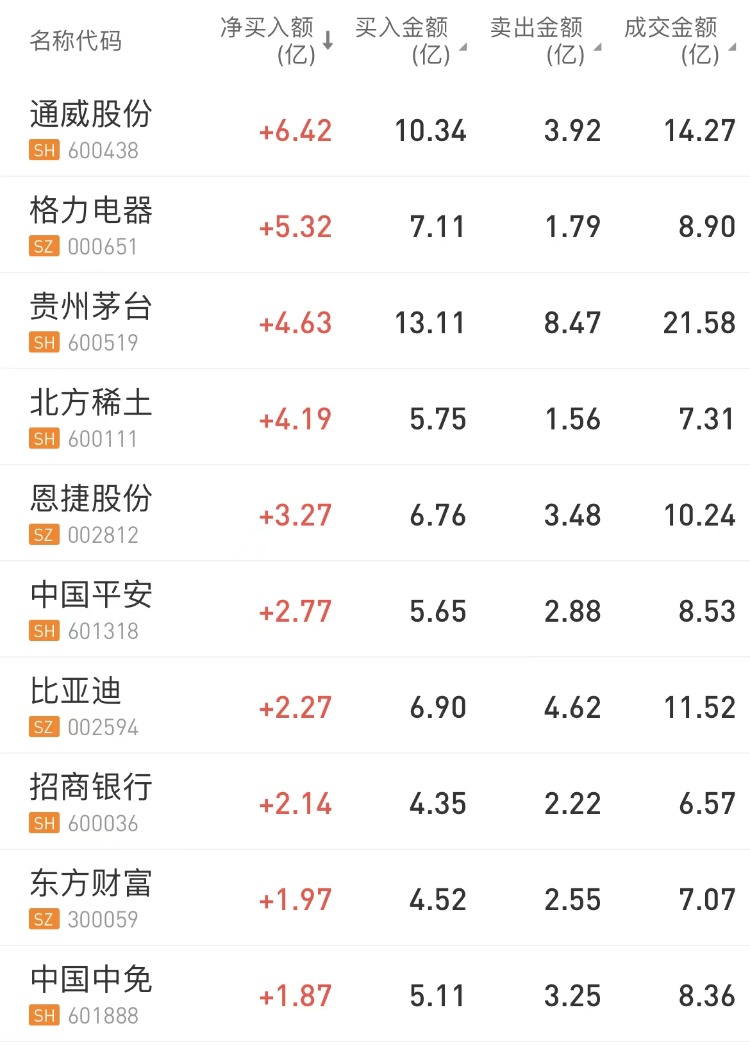 北上资金今日净买入通威股份6.42亿元,为今日买入之最;净买入格力电器5.32亿元。