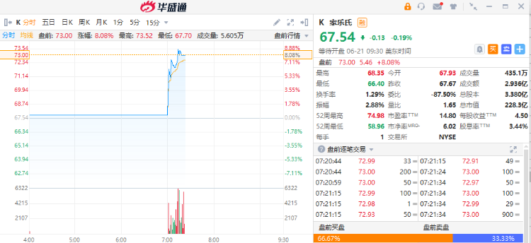 家乐氏(K)盘前直线拉升,涨超8%,报72.33美元。