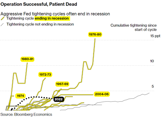 下图表明,美联储历次激进的紧缩周期往往以经济衰退而告终,即“手术(降低通胀)成功,患者(美国经济)死亡”。