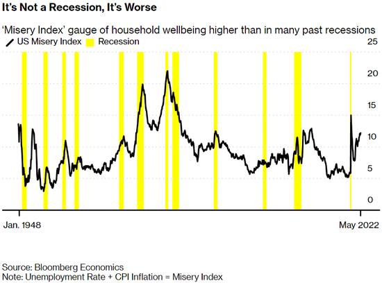 出人意料的通胀飙升引发了美股新一轮暴跌,并将美联储推向了更加鹰派的立场。美国消费者的乐观情绪跌至1978年以来的最低水平。自那以来,美国经济经历了三次最严重的衰退。