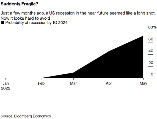 彭博经济研究(Bloomberg Economics)的最新经济预测显示,到2024年年初,美国经济出现衰退的可能性约为72%。而就在几个月前,这种可能性甚至不在预期之中。