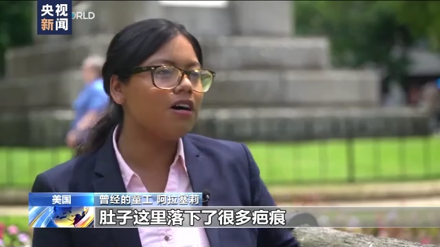 曾经的童工 阿拉塞莉:我就曾发生过意外,从拖拉机上面掉下来了,肚子这里落下了很多疤痕。当时在收割洋葱,手也被划伤了。