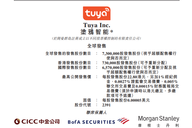 涂鸦智能已于2021年3月登陆美股,本次港股招股价较美股涂鸦智能(TUYA)收盘价2.46美元(折合港币19.188元),溢价发行18.8%。