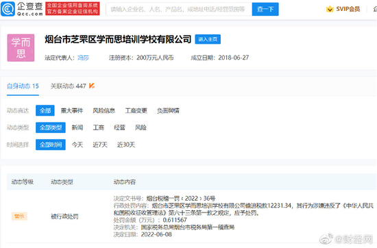 天眼查信息显示,2021年12月29日,北京学而思教育科技有限公司因编造虚假计税依据,违反税收征收管理法,被国家税务总局北京市海淀区税务局罚款5000元。该公司法定代表人樊保荣,大股东及疑似控制人为张邦鑫。
