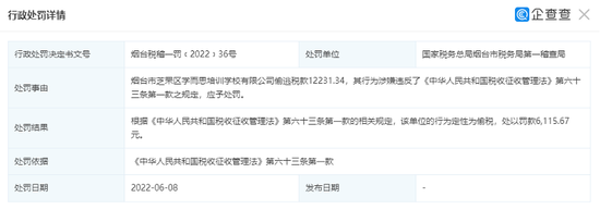 近日,烟台市芝罘区学而思培训学校有限公司偷逃税款12231.34元,其行为涉嫌违反了税收征收管理法第六十三条第一款之规定,被国家税务总局烟台市税务局第一稽查局处以罚款6115.67元。