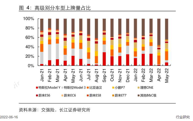 自主品牌和新势力均完成品牌向上,杀入20万、30万甚至40万级别的市场。这种向上同样获得消费者认可。以上海地区为例,6月前两周乘用车上险数合计1.6万辆,其中新能源销量0.83万辆,燃油车销量0.77万辆。新能源车中按品牌划分,自主品牌销量达到5694辆,占比7成,合资品牌和外资豪华品牌合计销量2668辆。另据汽车交强险数据显示,2021年12月,上海新能源汽车销量达到37692辆,市占率高达37.3%。相较于2018年新能源汽车8.73%的渗透率,其增速超过4倍。