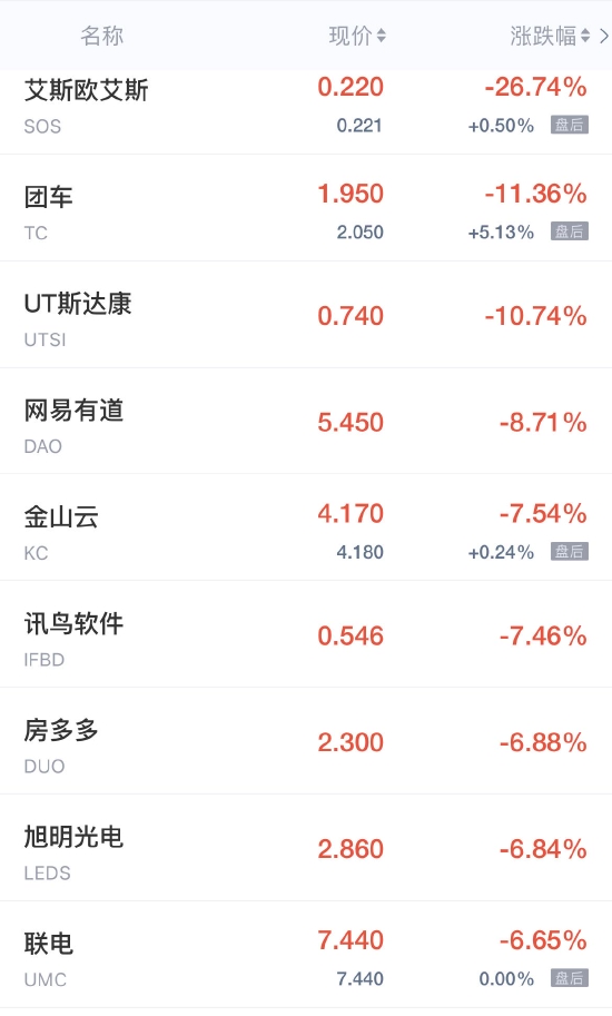 领跌中概股列表:
