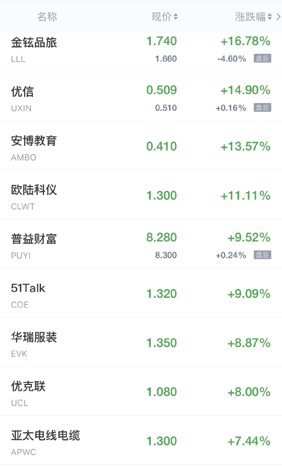 领涨中概股列表: