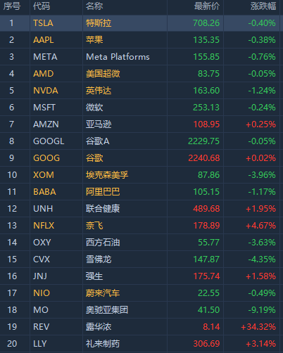 第17名蔚来收跌0.49%,成交18.3亿美元。蔚来在近期新车型ET7上搭载了最远500米探测距离的激光雷达,并选择与供应商合作开发的模式。业内人士认为未来量产的成本下降空间非常可观。