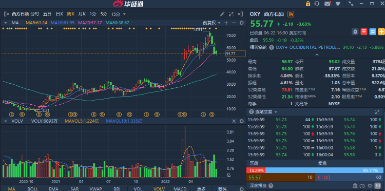自2月俄乌冲突爆发以来,国际油价加速上涨,西方石油股价也因此水涨船高。今年5月底,西方石油股价一度在盘中升至73.9美元的四年新高。尽管6月以来西方石油股价从峰值跌落回55元左右,但今年以来该公司股价累计涨幅仍然有94.12%。