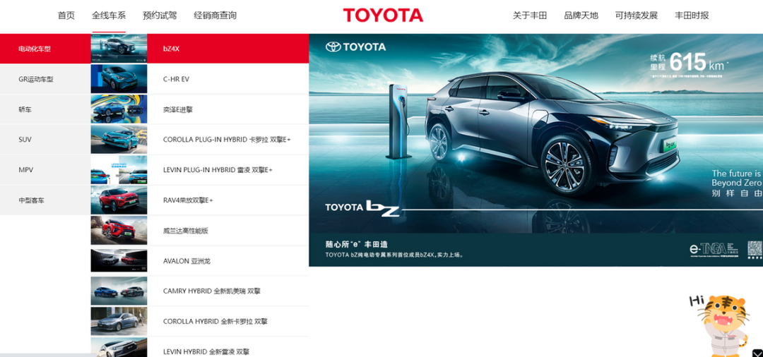 从丰田中国的官网上可以看到,丰田的电动化车型列表里面,包含着大量由传统燃油车型衍生而来的混动款,最新推出的bZ4X硬是和混动车型放在了一起。