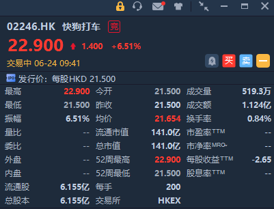 华盛资讯6月24日讯,同城货运平台快狗打车 $02246.HK 首挂盘初拉升6.51%,一手账面浮盈近300港元,当前成交额1.12亿港元,最新总市值超141亿港元,昨日暗盘收跌1.86%。