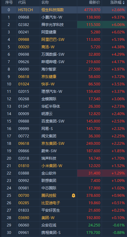 华盛资讯6月24日消息,恒生科技指数现涨2.66%,港股阿里巴巴涨5.28%,网易涨2.39%,百度涨2.6%5,小米微涨。