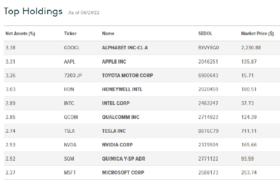 截至6月21日,该ETF追踪73个标的,从各个股票持有份额来看,权重较为分散。最大重仓股为谷歌 $GOOGL ,占比3.38%;苹果 $AAPL 为第二大重仓股,占比3.31%;英特尔 $INTC 第5位,占比2.89%;高通 $QCOM 排第六,占比2.85%;特斯拉 $TSLA 居第七(2.74%),英伟达 $NVDA 居第八(2.53%)。
